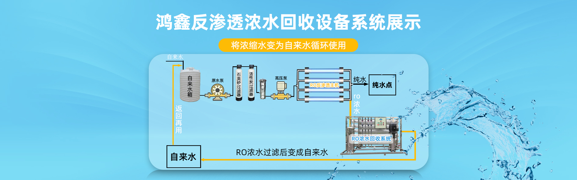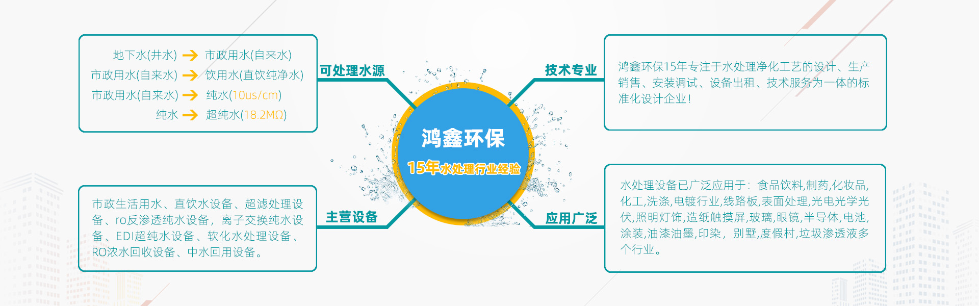 鴻鑫環科技是一家從水處理工程工藝的設計、生產、銷售、安裝、設備維護、設備出租、技術服務為一體的一站式水處理設備供應商,水處理設備類型有:生活用水處理設備、直飲純凈水設備、超濾水處理設備、ro反滲透純水設備,離子交換純水設備、EDI超純水設備、軟化水處理設備、RO濃水回收設備、中水回用設備。